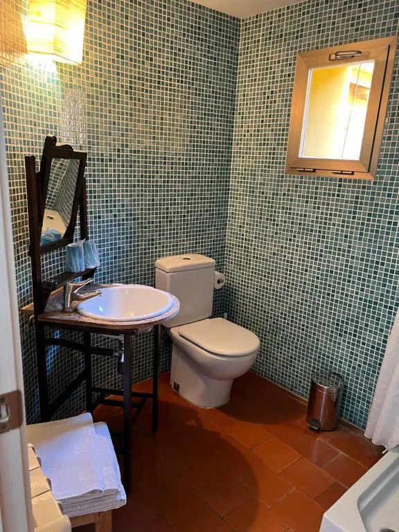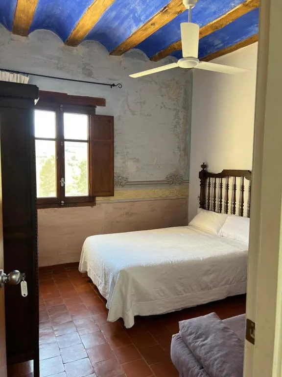 Habitación doble con suelo de gres/mármol. Esta habitación dispone de una cama de matrimonio de 135 cm. El baño está fuera de la habitación, pero es de uso privado.